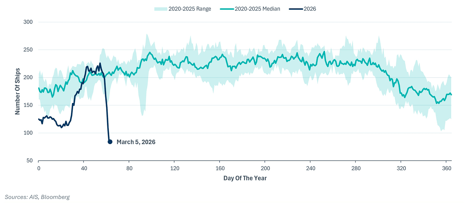 For financial markets, the most pressing issue arising from events in the Middle East is the flow (or disruption) of energy through the narrow Straitof Hormuz. In the week before hostilities erupted, roughly 735 commercial vessels, including 210 tankers and gas carriers, transited the Strait.In the five days since the war began, ship traffic slowed to its lowest since 2020. Over 150 tankers are waiting outside the Strait, a container shiphas already been hit, and two others have turned around. It’s little surprise that the price of Brent oil has spiked 17% as of Thursday’s close, andEuropean benchmark gas futures surged 59% after attacks on Qatari LNG facilities forced a production suspension. The ultimate macro impact willdepend on the duration of the disruption. Days or weeks versus months and quarters? Our main view is that the longer the energy supply flow isrestricted, the bigger the risk to global economic growth, rather than inflation. In particular, Asia and Europe would be more exposed than theU.S., which receives only about 2% of energy shipments through the Strait.